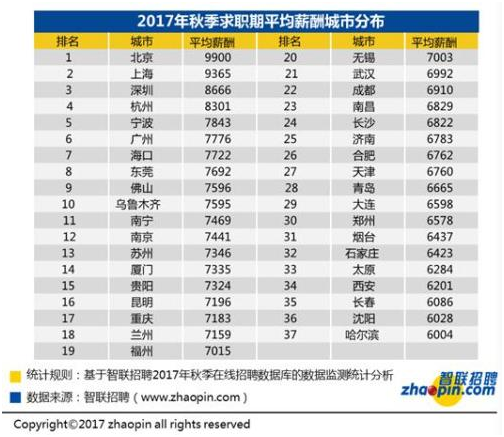 报告显示,根据2017年秋季在线数据显示,全国37个主要城市的平均招聘薪酬为7599元,本季度平均薪酬重新回升,环比上升幅度3%。