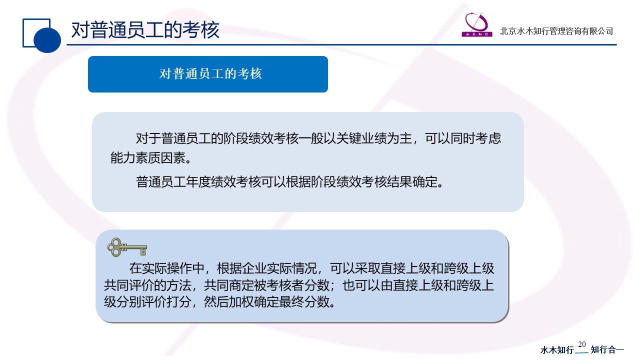 对于普通员工的阶段绩效考核一般以关键业绩为主,可以同时考虑能力素质因素。普通员工年度绩效考核可以根据阶段绩效考核结果确定。