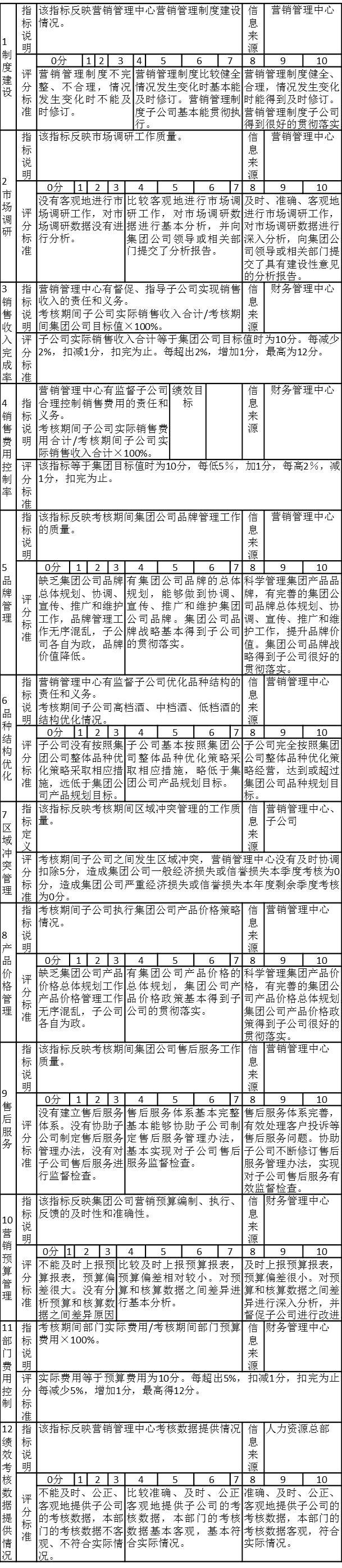 集团营销管理总部黄总监:目前的考核指标基本覆盖了我部门的主要工作,对于“销售收入完成率”、“销售费用控制率”、“应收帐款周转率”等定量指标能反应我部门的主要工作成果。“区域冲突管理”是个半定量指标,评价标准是“考核期间子公司之间发生区域冲突,营销管理总部没有及时协调扣除5分,造成集团公司一般经济损失或信誉损失本季度考核为0分,造成集团公司严重经济损失或信誉损失本年度剩余季度考核为0分。”这个指标操作性差一些,经济损失、信誉损失很难界定清楚,应该进一步明确界定。对于其他定性指标,我感觉目前压力很大,的确很多工作目前没有开展或者开展不力,例如“品种优化”这几年集团公司一直在抓这个事情,但是各个子公司以局部利益为重,很多工作很难协调,因此品种优化工作成效不大,以目前状况,恐怕只能得2、3分;品牌管理工作目前几乎还没开展,恐怕这项指标要得0分。但总的来说,这些关键业绩指标还是比较科学的,基本能反应工作的成效,实行这套绩效考核方案后一定能促进管理的提升,为企业创造价值。