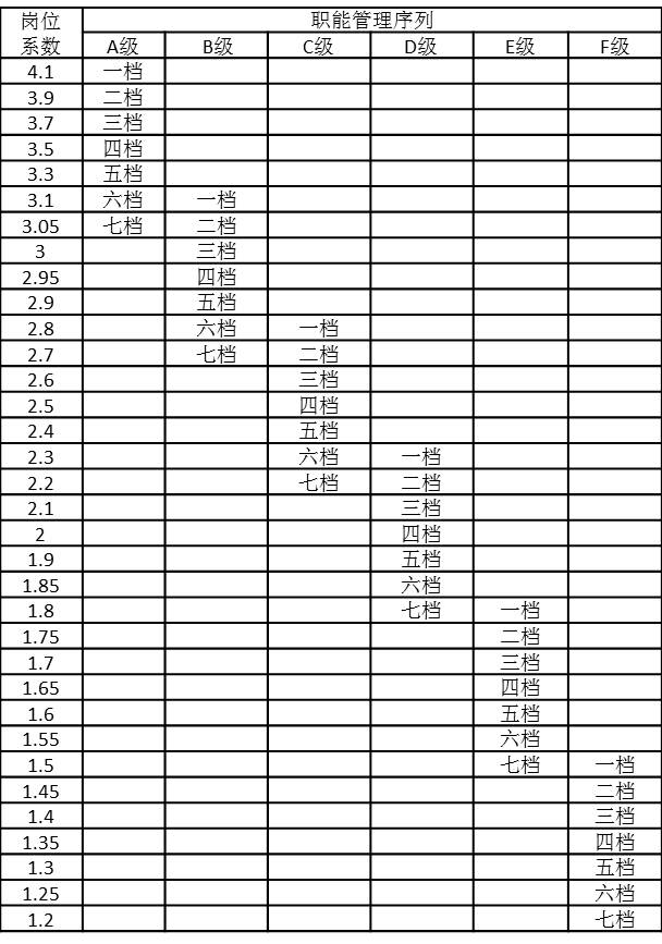 中高层管理序列、经营序列、专业技术序列、项目管理序列、职能管理序列岗位系数分别如表4-23、4-24、4-25、4-26、4-27所示。