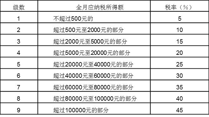 (注:本表所称“全月应纳税所得额”是指依照本法的规定,以每月收入额减除费用2000元后的余额或者减除附加减除费用后的余额。)