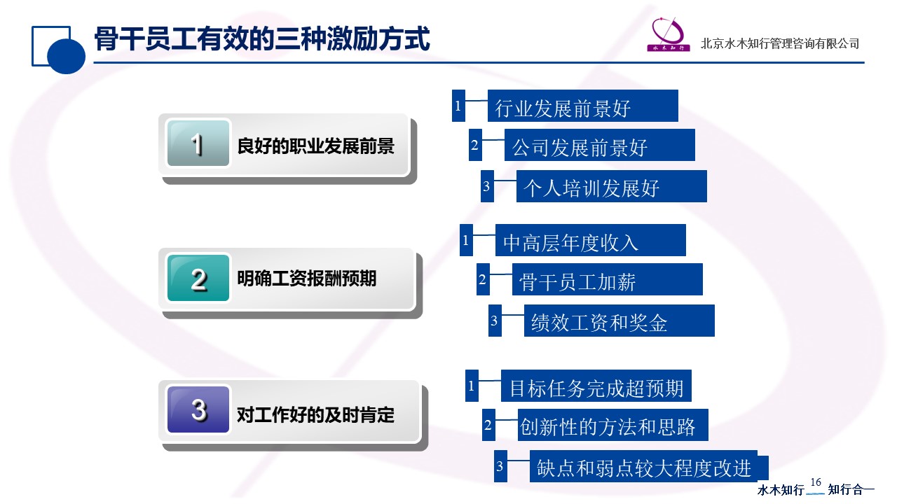 在我国目前经济发展阶段,对大多数骨干员工最有效的激励方式包括:一是良好的职业发展前景;二是明确的加薪预期;三是工作好的及时肯定。因此建立系统的员工职业发展体系和工资晋级体系是非常重要的。